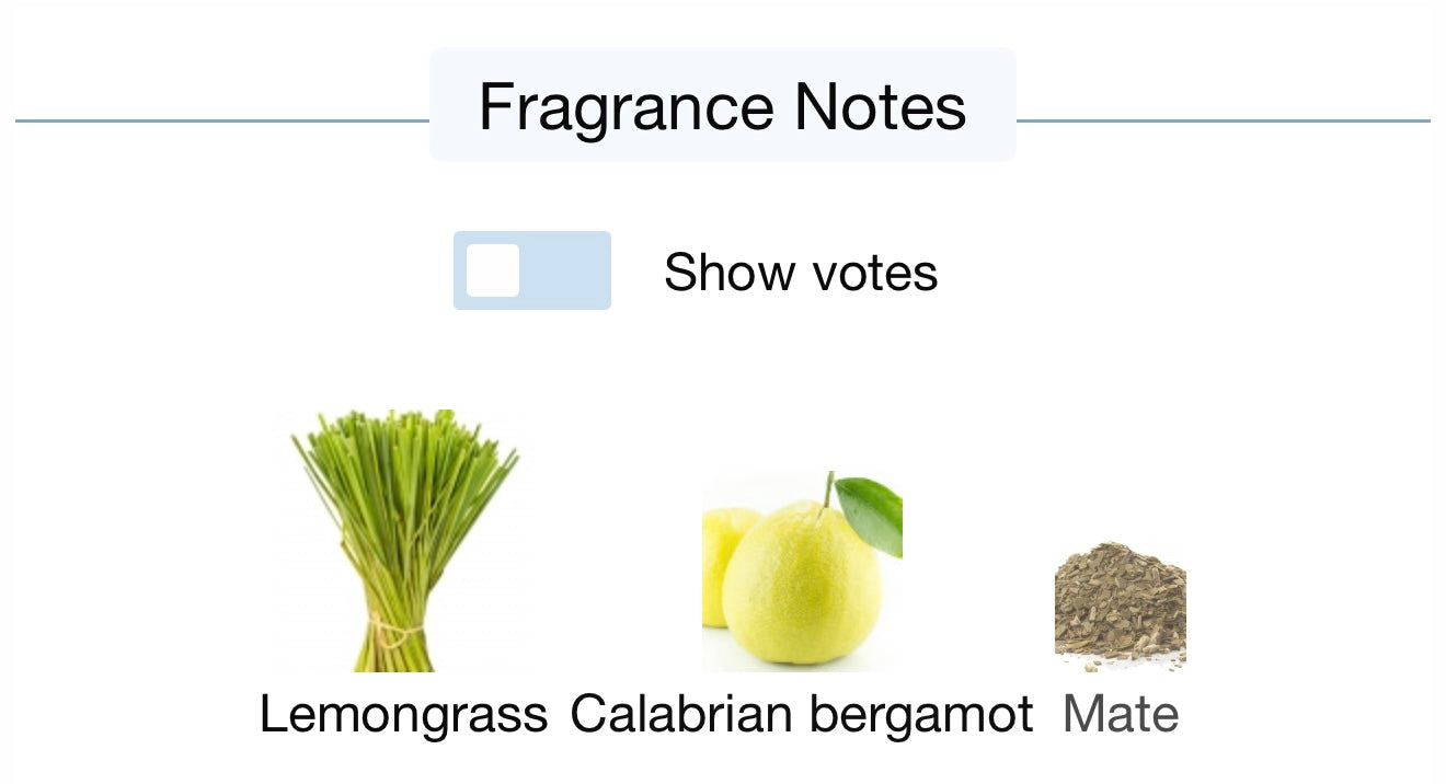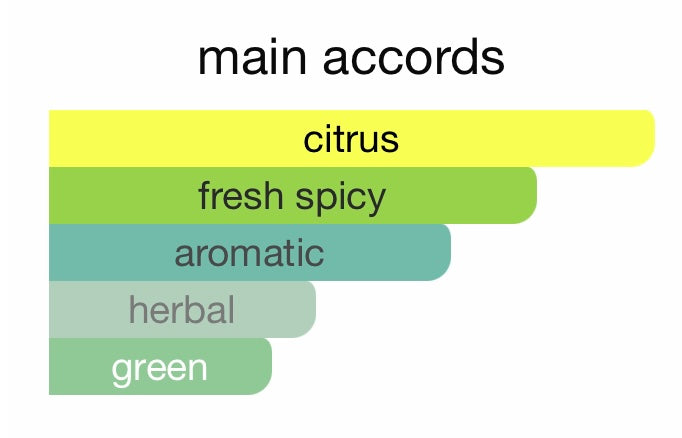 A szívjegyekben a mate tea zöld, enyhén füstös karaktere mélységet és természetességet ad, míg az alapjegyekben a citromfű lágy fűszeressége és aromás tisztasága biztosítja az illat kiegyensúlyozott, hosszan tartó lecsengését.