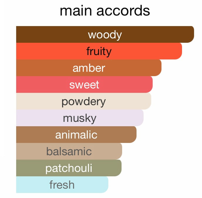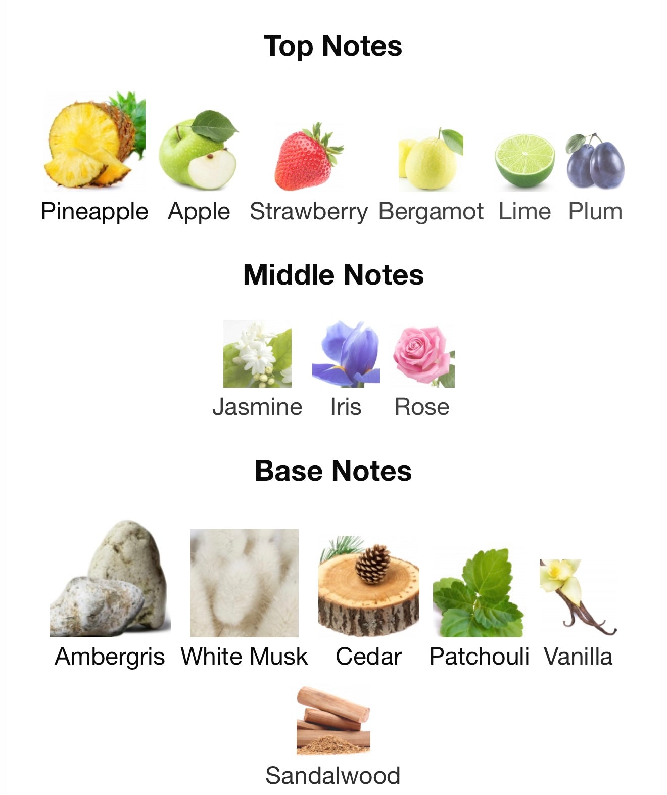 A szívjegyekben a jázmin, a rózsa és az írisz elegáns virágos harmóniája bontakozik ki, melyet az alapjegyek bársonyos melegsége követ. A szantálfa, az ámbra, a fehér pézsma és a vanília együttese érzéki, hosszan tartó lecsengést biztosít az illatnak.
