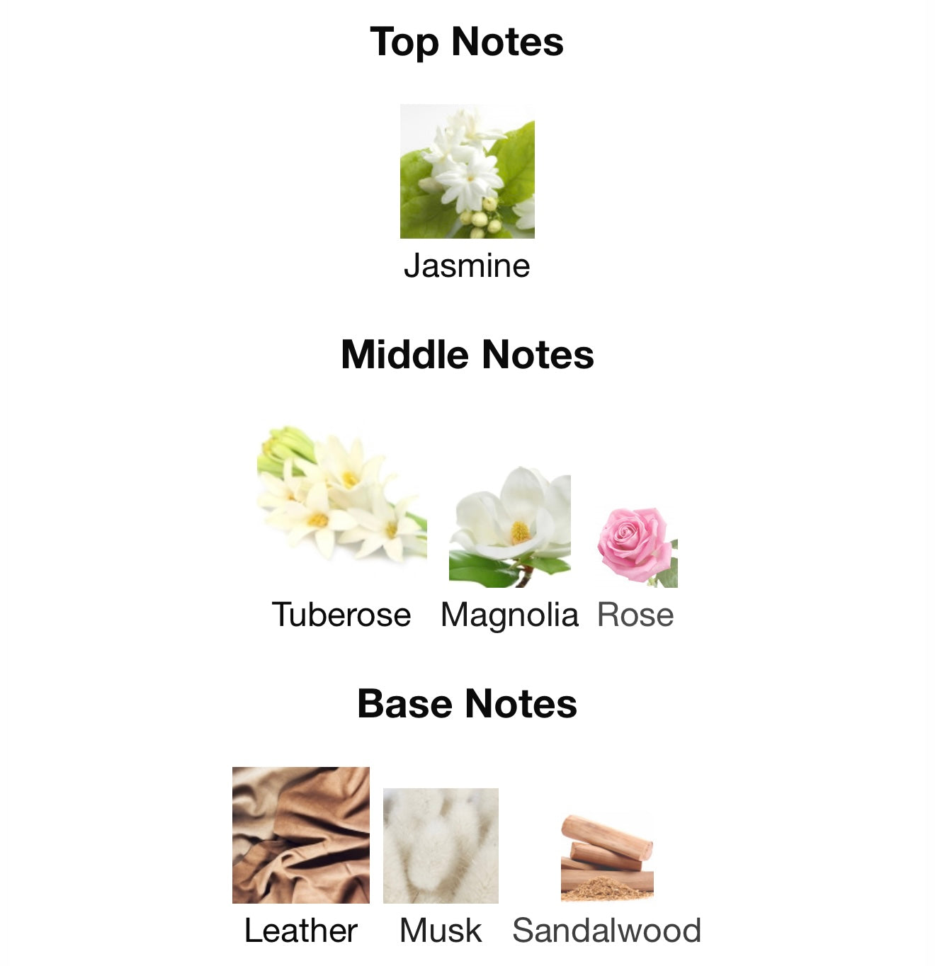 A szívjegyekben a magnólia és a narancsvirág nyújtanak frissítő virágos könnyedséget, míg az alapjegyekben a bőrös akkordok és az ámbra adnak mélységet és meleg, hosszan tartó lecsengést.