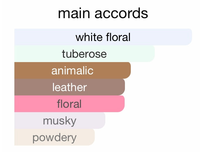 Az illat nyitánya gazdag és kifinomult: a tubarózsa krémes, buja karaktere dominál, amelyet a jázmin finom, édes aromája ölel körbe.